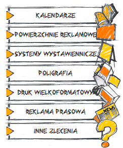 Na naszej stronie oferujemy m.in.: kalendarze firmowe, reklamę zewnętrzną (organizacja kampanii outdoorowych), poligrafię, druk wielkoformatowy oraz reklamę w prasie.