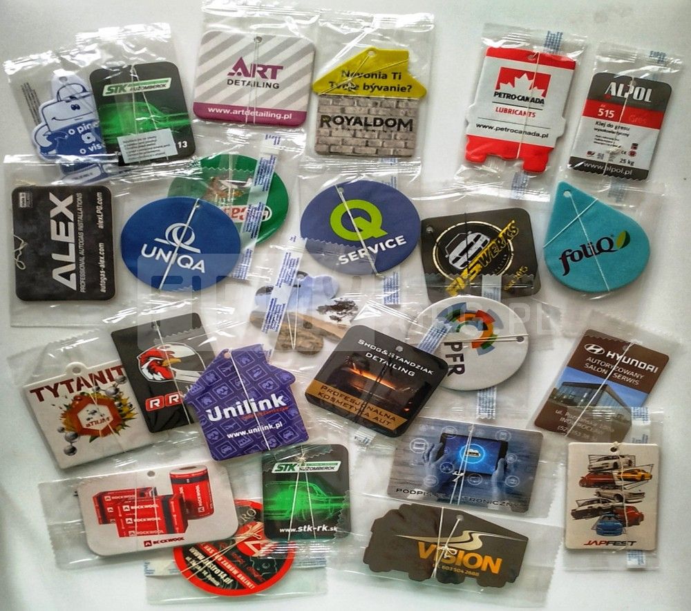 - zawieszki zapachowe z dwustronnym nadrukiem w pełnym kolorze
